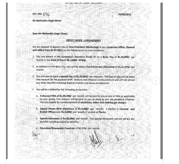 ଦର୍ଶକବନ୍ଧୁ ସେ ହେଉଛନ୍ତି ଭାରତୀୟ କ୍ରିକେଟ ଟିମ ର ପୂର୍ବତନ ଅଧିନାୟକ । ମିଷ୍ଟର କୁଲ ନାମରେ ସେ ବେଶ ଜଣାଶୁଣା । ସଫଳ ଅଧିନାୟକ ମାନଙ୍କ ମଧ୍ୟରେ ହୁଏ ତାଙ୍କର ଗଣତି । ଅନେକ ସମୟରେ ସେ ଥାଆନ୍ତି ଚର୍ଚାରେ । ଆପଣ ଜାଣିସାରିବେଣି ଆମେ କାହା ବିଷୟରେ କହୁଚୁ । ହଁ ଦର୍ଶକବନ୍ଧୁ ଆମେ କହୁଚୁ ମହେନ୍ଦ୍ର ସିଂ ଧୋନିଙ୍କ କଥା । ଆପଣ ଜାଣିଥିବେ ବ୍ୟକ୍ତିଗତ ଜୀବନକୁ ନେଇ ହେଉ କିମ୍ବା କ୍ରିକେଟ କୁ ନେଇ , ଅନେକ ସମୟରେ ଚର୍ଚାରେ ଥାଆନ୍ତି ଏହି କ୍ରିକେଟର ଜଣଙ୍କ । ଏବେ ପୁଣି ଠାରେ ସେ ଚର୍ଚ୍ଚା କୁ ଆସିଥିବା ଦେଖାଯାଇଛି । ଆଉ ସୋସିଆଲ ମିଡ଼ିଆରେ ଏବେ ମାହି ଙ୍କ ସହ ଜଡିତ ଏକ ଫଟୋ ଦ୍ରୁତ ମାତ୍ରାରେ ଭାଇରଲ ହେବାରେ ଲାଗିଛି । ତେବେ ଆମେ କହିରଖିବୁ ଯେ, ଏବେ ସୋସିଆଲ ମିଡିଆରେ ଭାଇରାଲ ହେଉଥିବା ଫଟୋ ହେଉଛି ପୂର୍ବତନ ଭାରତୀୟ ଅଧିନାୟକ ମହେନ୍ଦ୍ର ସିଂ ଧୋନିଙ୍କ ଜବ୍ ଲେଟେର । ଆଉ ମହେନ୍ଦ୍ର ସିଂ ଧୋନିଙ୍କ ଏହି ଜବ୍ ଲେଟର ୨୦୧୨ ମସିହାର ବୋଲି ଜଣାପଡିଛି । ସୋସିଆଲ ମିଡିଆରେ ମହେନ୍ଦ୍ର ସିଂ ଧୋନିଙ୍କ ଜବ୍ ଲେଟର ଅନୁଯାୟୀ କ୍ୟାପଟେନ କୁଲ ଇଣ୍ଡିଆ ସିମେଣ୍ଟରେ ଭାଇସ ପ୍ରେସିଡେଣ୍ଟ ପଦ ପାଇଛନ୍ତି । ଏହି ଚିଠିରେ ଲେଖାଯାଇଛି ଯେ ମହେନ୍ଦ୍ର ସିଂ ଧୋନି ଏହି ପଦବୀ ପାଇଁ ମାସକୁ ୪୩ ହଜାର ଟଙ୍କା ପାଇବେ । ଏହା ବ୍ୟତୀତ, ଦୈନିକ ଭତ୍ତା ସହିତ ଅନ୍ୟାନ୍ୟ ଖର୍ଚ୍ଚ ମିଶାଇଲେ ତାଙ୍କୁ ୬୦ ହଜାର ଟଙ୍କା ମିଳିବ ।